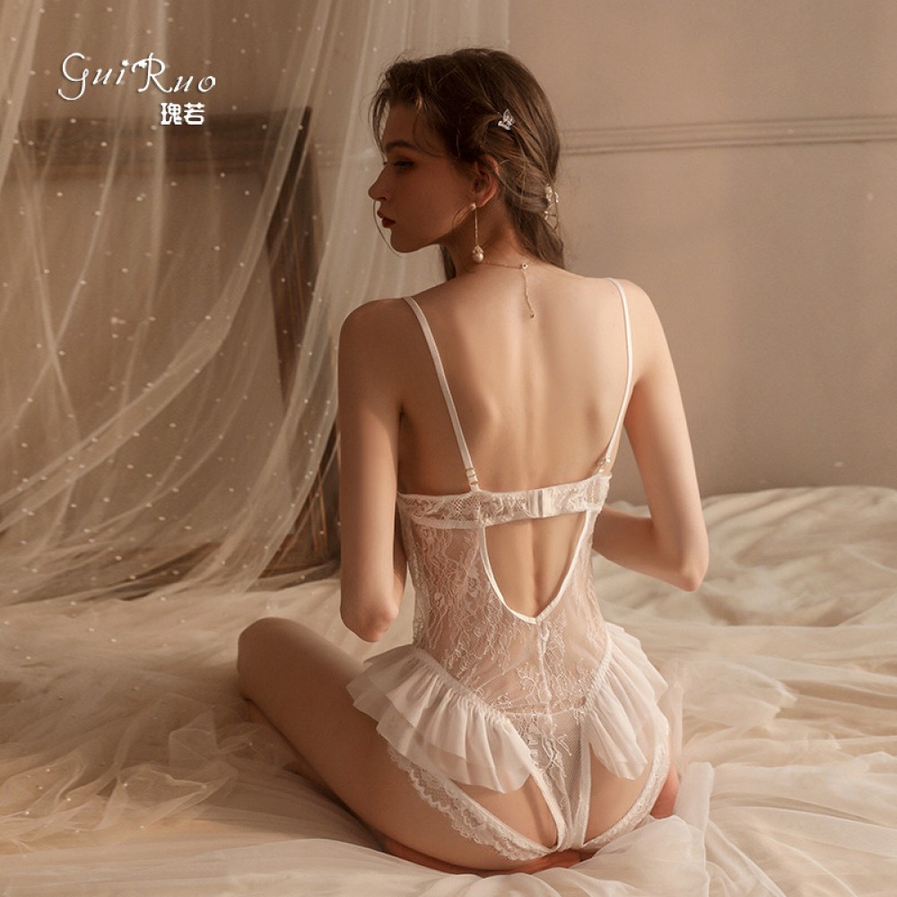Guiruo Fun Lingerie Sexy Hidden Button Open Breast Pad One Piece Dress with Open Back Perspective Steel Ring Uniform Fury Set 2062