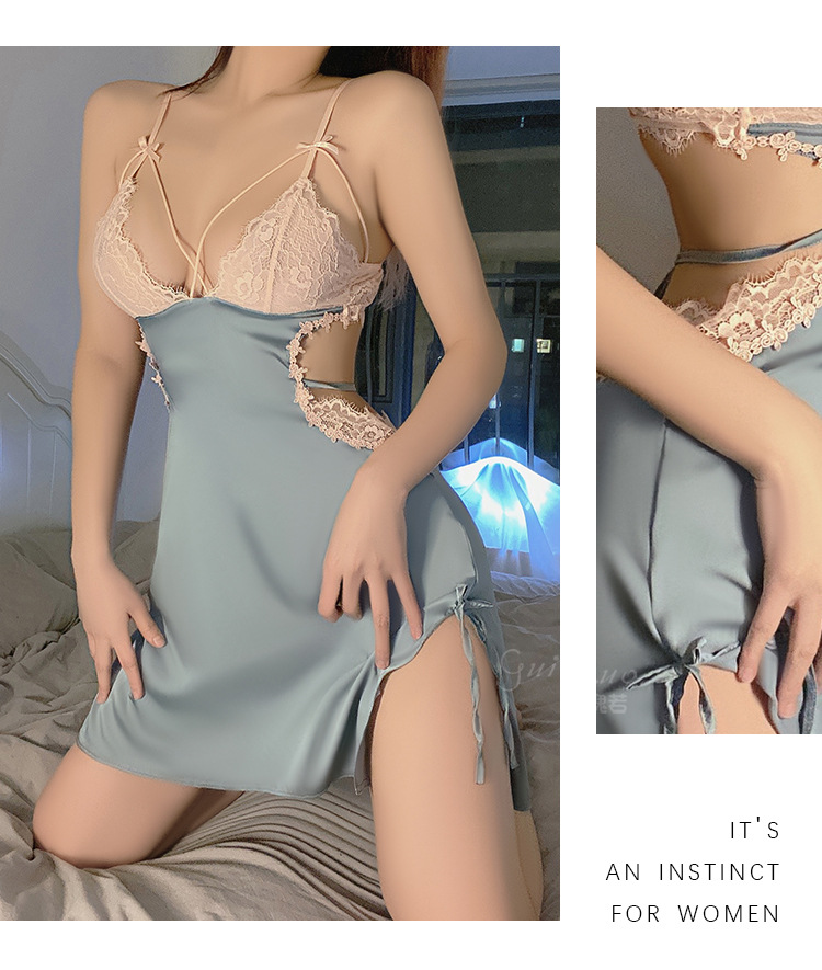 Guiruo Spring/Summer Women's Sexy Deep V Satin Private Dress with Hollow Waist Open Back Suspended Sleeping Dress Home Suit Set 797
