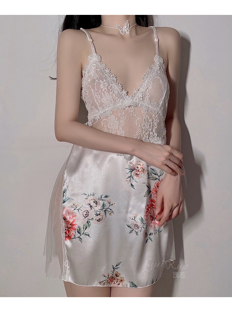 Guiruo Summer Pajamas Women's Sexy Deep V Lace Perspective Backless Print Hanging Pajama Dress Home Suit Set 19161