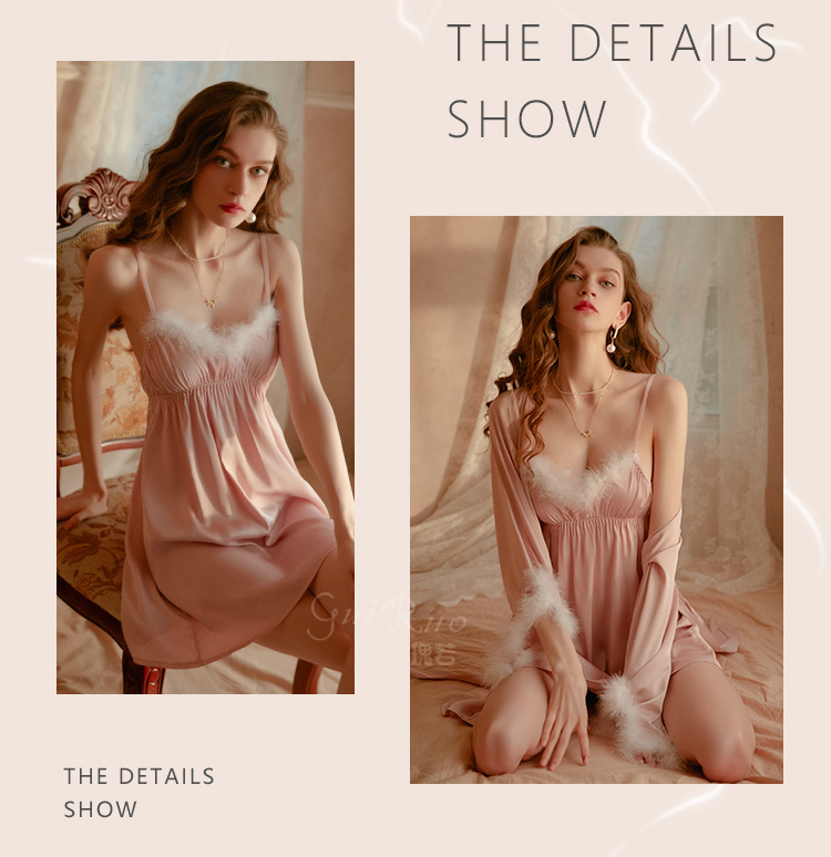 Guiruo Brand Sexy Satin Plush Suspended Nightgown Lace up Nightgown Women's Two Piece Home Fur Set 19055
