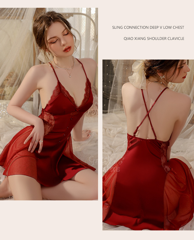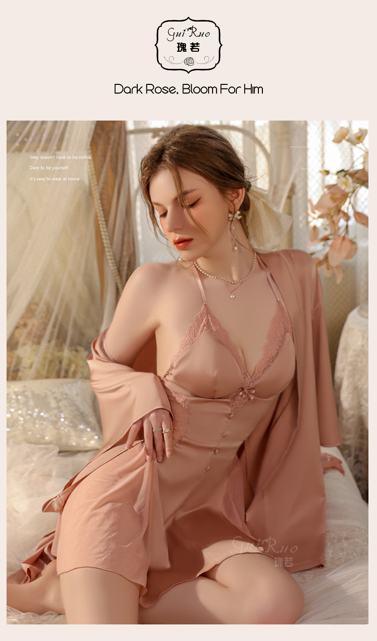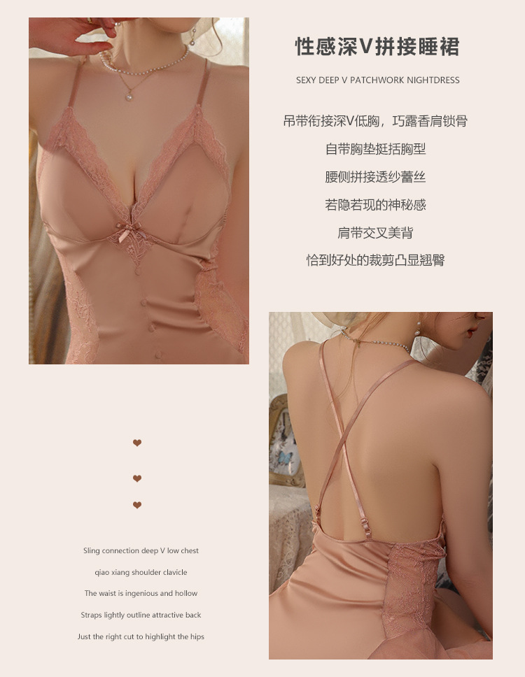 Rose Like Spring and Summer Sexy Open Back Ice Silk with Chest Cushion Pure Desire Wind Suspended Sleeping Dress Outer Robe Women's Home Set 3337