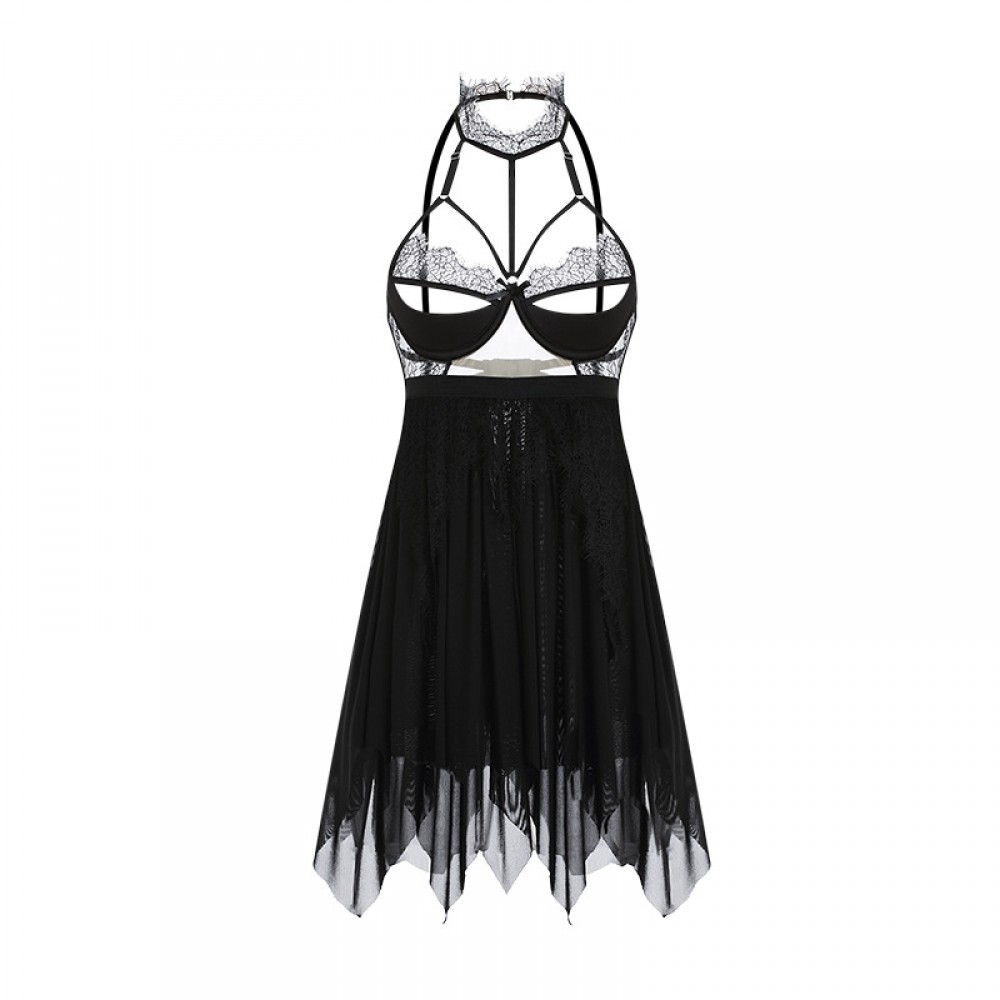 Guiruo Fun Lingerie Sexy Hanging Neck Pajama Steel Ring Gathering Chest Cushion Sling Sleeping Dress Women's Home Suit Set 1734