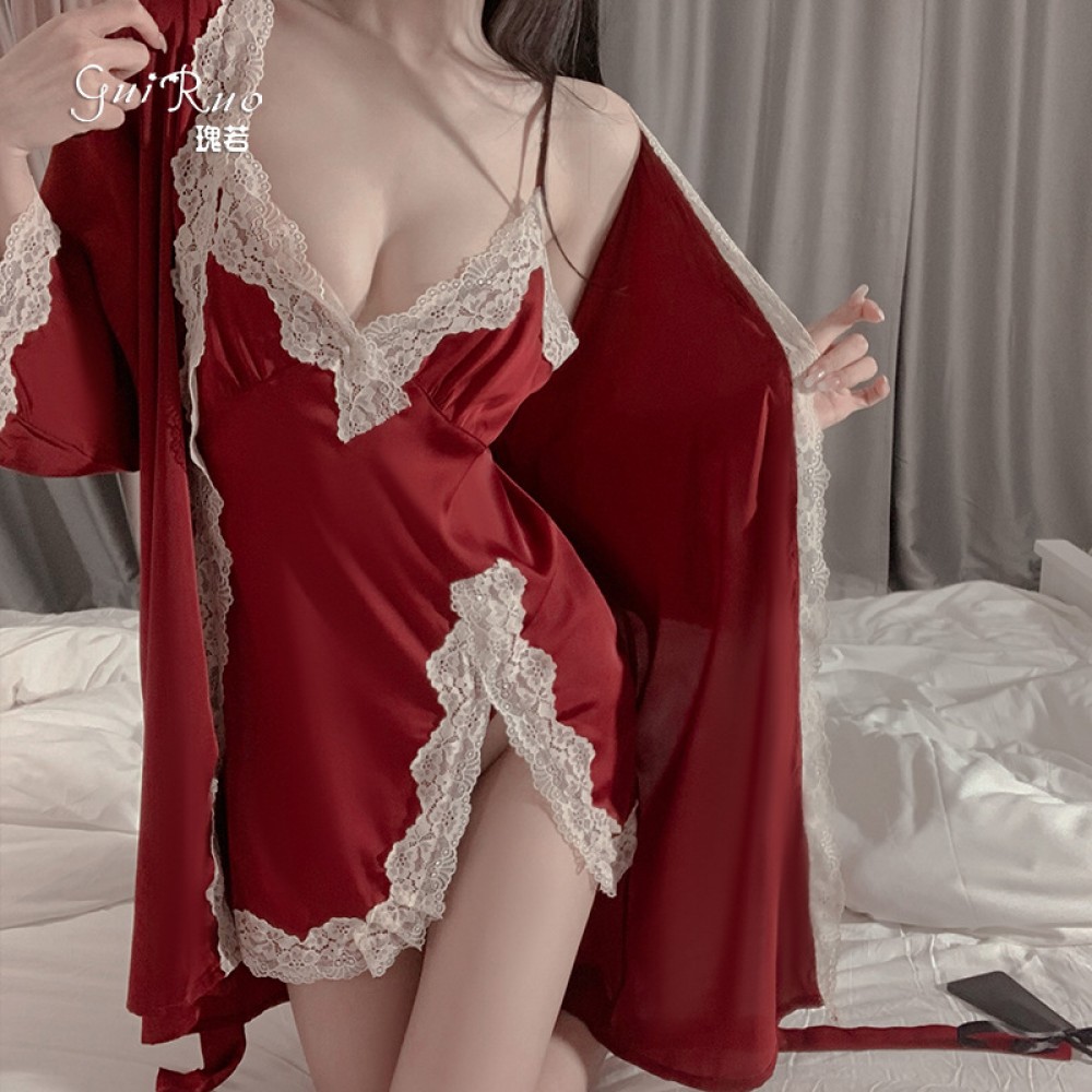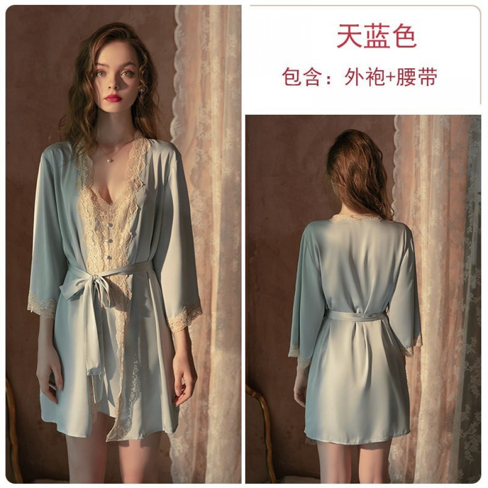 Rose Like Spring/Summer Sexy Lace Perspective Attractive Split Open Back Suspended Dress Lace up Outer Robe Home Suit Set 893