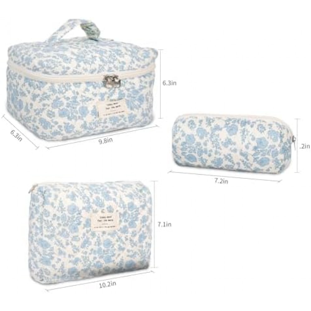 GISMTR 3Pcs Cotton Quilted Makeup Bag Large Travel Cosmetic Bag Coquette Makeup Pouch Cute Aesthetic Floral Toiletry Bag for Women Girls, flower-B, Cute